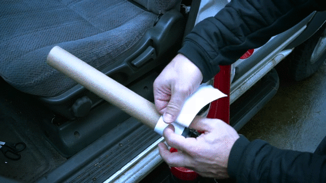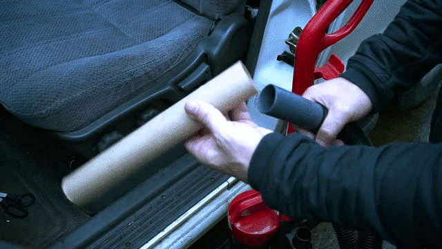- Bạn chuẩn bị 1 lõi giấy vệ sinh, gắn lõi giấy vào đầu máy hút bụi, sau đó dán cố định lại bằng băng keo bản lớn.